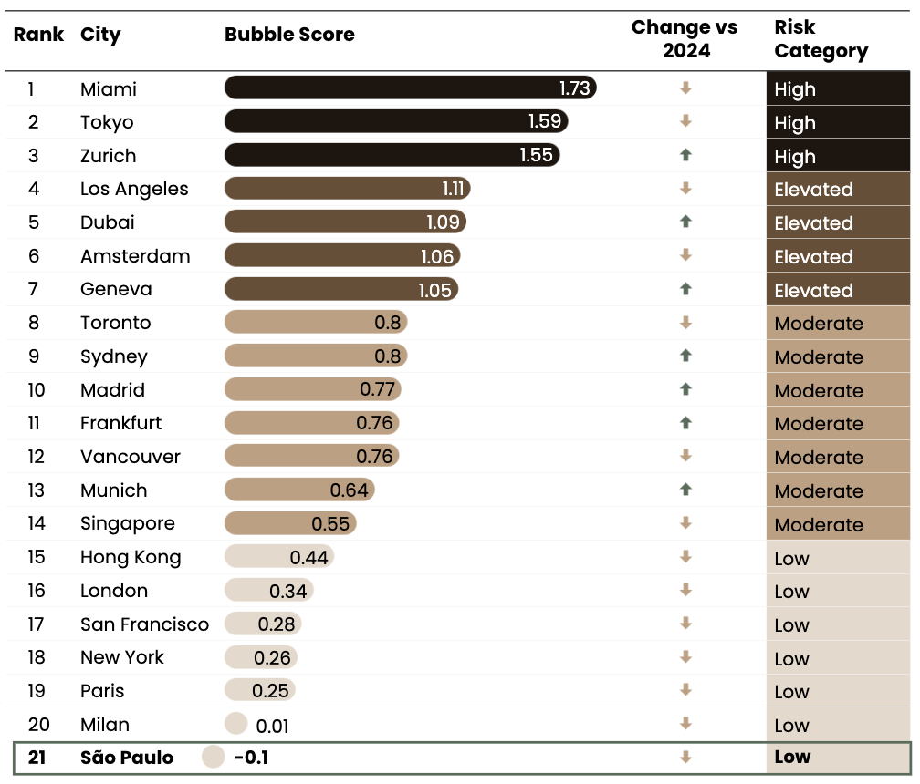 While global hubs like Miami and Zurich face high bubble risks, the UBS Real Estate Bubble Index rates São Paulo as highly undervalued with a score of -0.1.